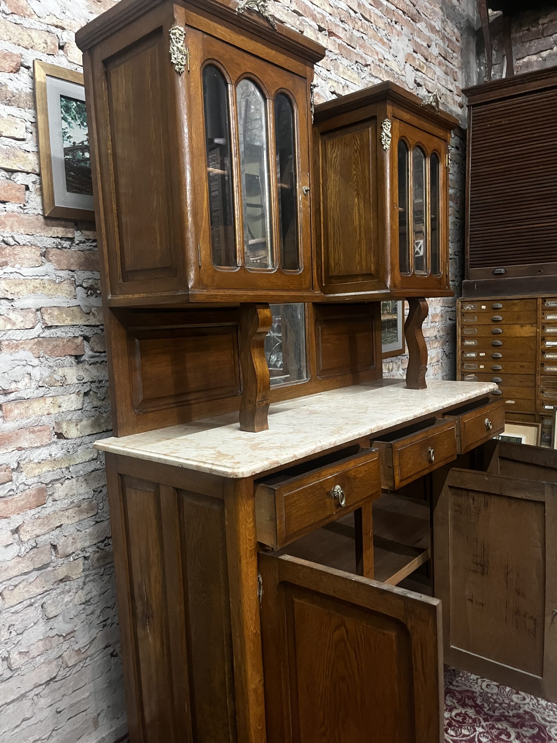 APARADOR CON ALZADA ANTIGUO EN ROBLE DE ESLAVONIA, DE ESTILO CLÁSICO Y GRAN PRESENCIA. CUENTA CON TRES PUERTAS INFERIORES Y CAJONES FUNCIONALES, ADEMÁS DE VITRINA SUPERIOR CON VIDRIO Y DETALLES EN BRONCE QUE REALZAN SU ELEGANCIA. LA TAPA DE MÁRMOL EN PERFECTO ESTADO LE APORTA DISTINCIÓN Y RESISTENCIA.