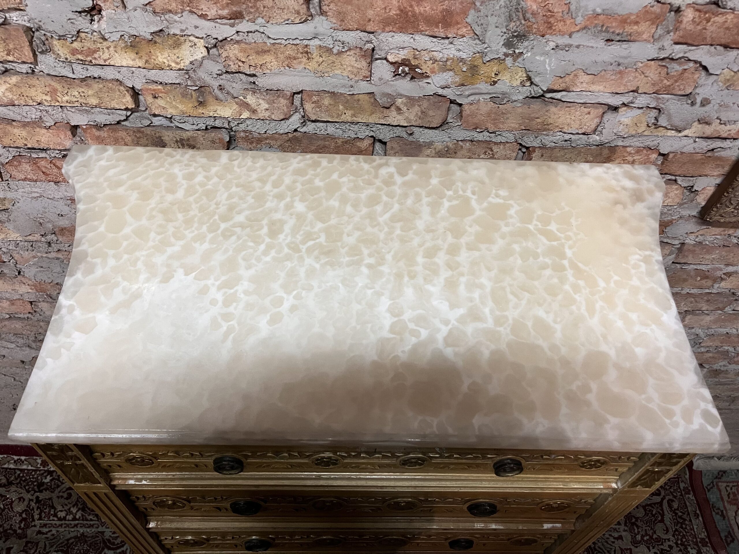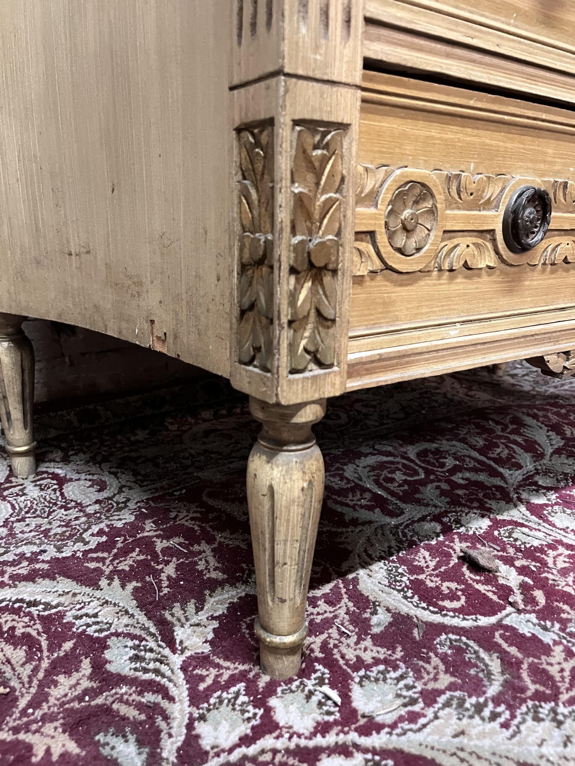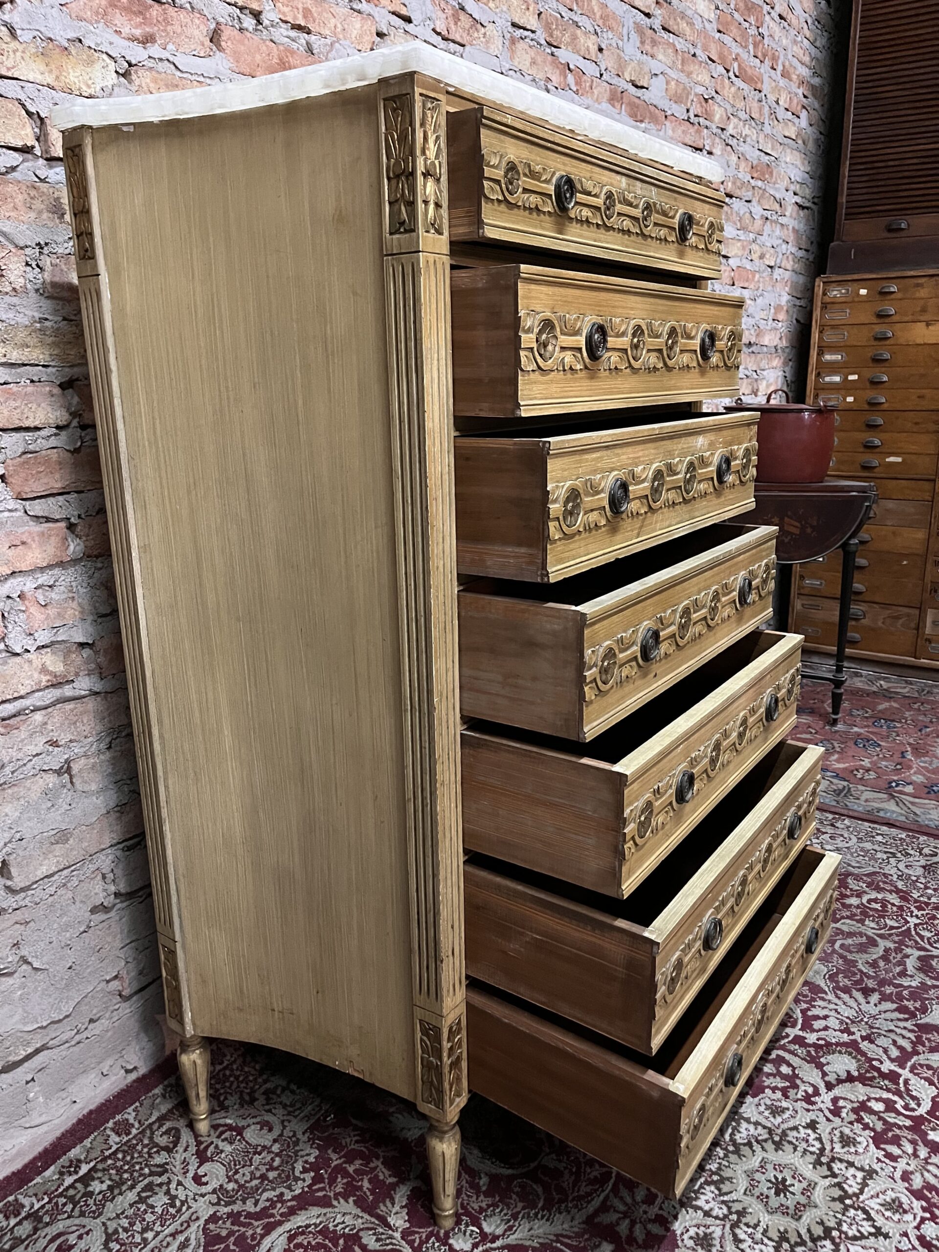 cómoda chifonier francés Luis XVI patinado con mármol con detalles en dorado y herrajes en bronce