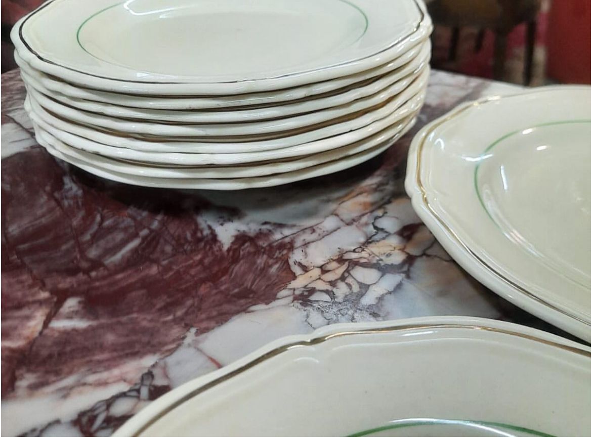 Increíble juego de 12 platos ingles de postre, en muy buen estado con el ribete dorado ( algunos craquelados que