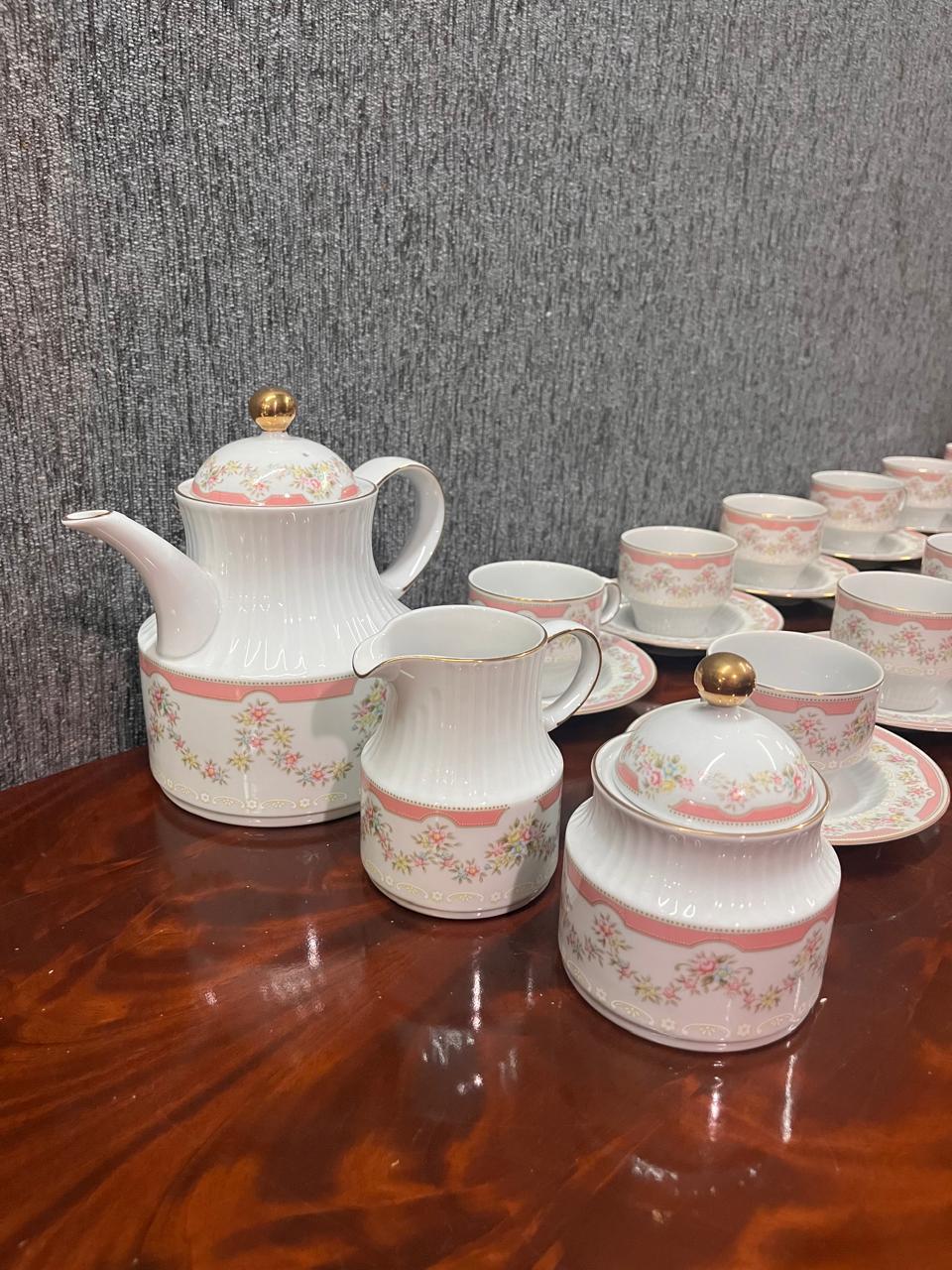 Único juego de té en porcelana tsuji para 12 personas, mas el juego de bandeja y platos de masas/postre, del modelo más