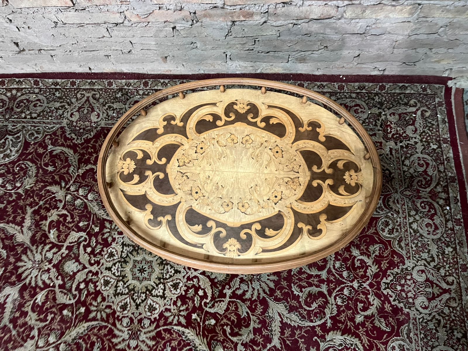 Muy linda mesa de sala oval ingles pie central con marquetería en color madera en muy
