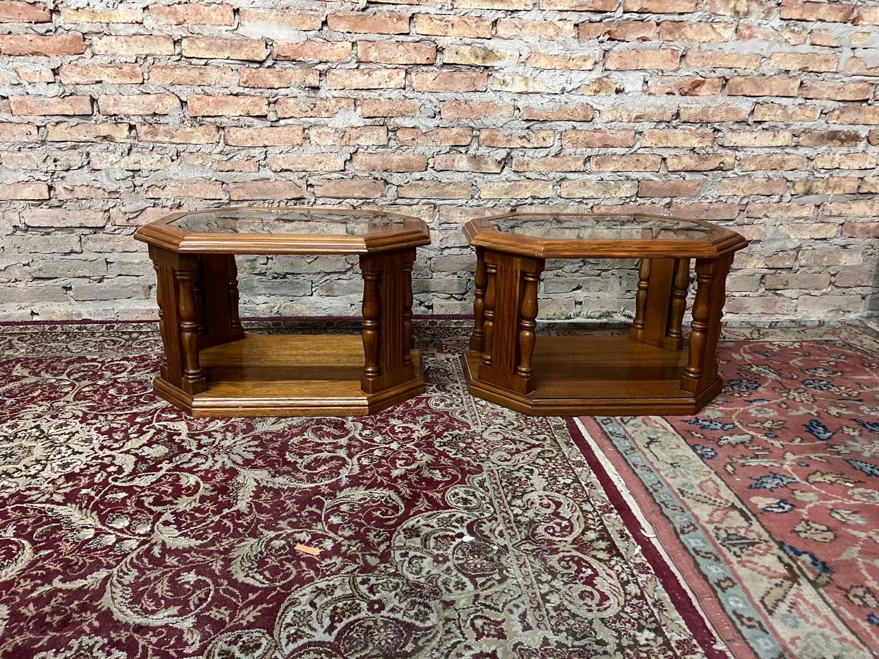 Espectacular par de mesas de sala en cerejeira, muy buen tamaño con tapa en vidrio y esquineros torneados que