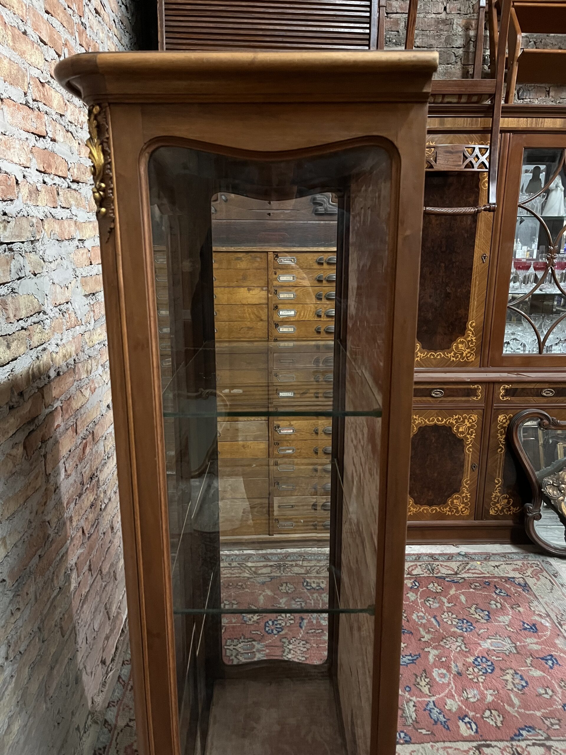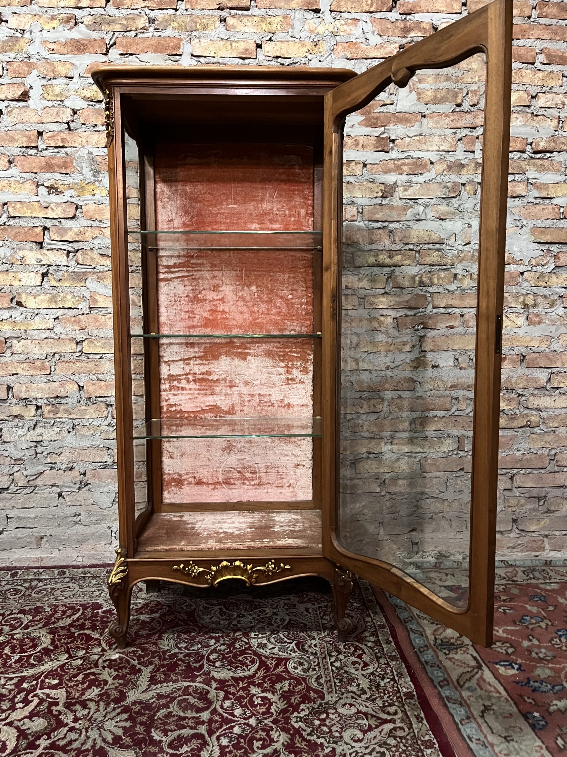 Imponente vitrina francés Luis XV de 1 puerta con vidrios biselados detalles en dorado a la hoja y una talla de primera calidad de